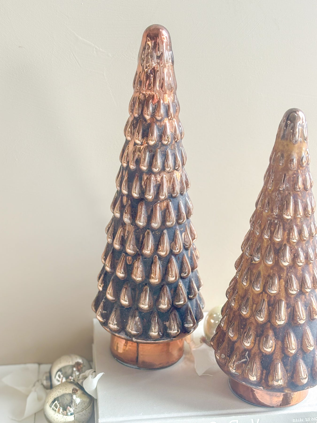 Add a warm, enchanting glow to your holiday décor with the Copper Twinkle Tree. A glass Christmas tree finished in a rich copper shimmer and illuminated from within. This battery-operated light-up piece brings a soft, magical twinkle to mantels, shelves, and festive tablescapes.