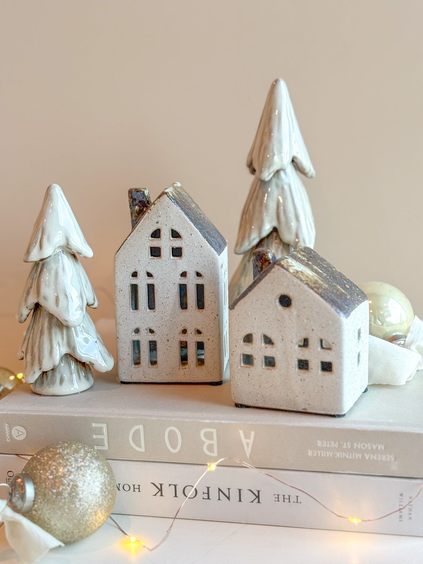 Add a charming, handcrafted touch to your home with this stoneware home, finished in a unique reactive white and brown glaze. Each piece is carefully crafted, with slight variations in color and texture, making every house one-of-a-kind.